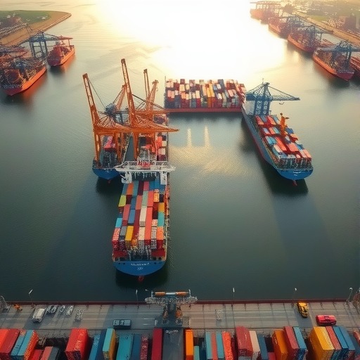 9月12日15时43分,在位于湖北襄阳宜城市的襄阳小河港,一台大型门机抓起船上的硫精矿,通过卸料斗装进货车,4个泊位停满千吨级船舶,不远处几艘船舶等待靠岸卸货。
